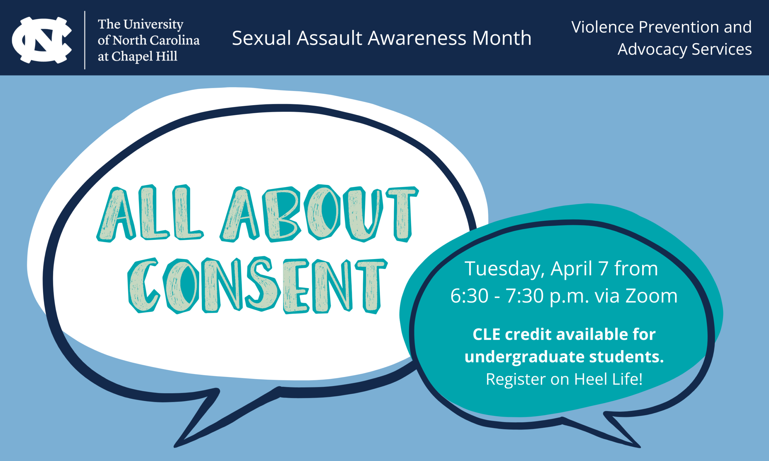 In recognition of Sexual Assault Awareness Month, come learn all about consent! We’ll discuss the basics, get some practice, and answer questions. CLE credit is available for undergraduate students. Register on Heel Life to receive the Zoom link.