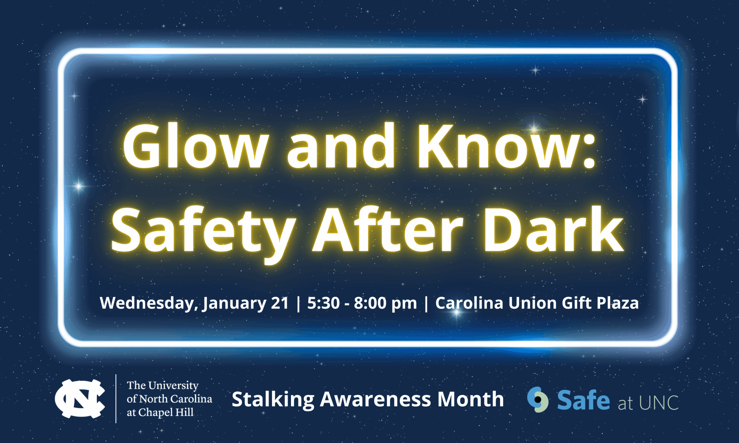 [Image description: Dark blue background with stars. Neon blue curved rectangle containing neon yellow text that says “Glow and Know: Safety After Dark.” Event information in white below. White text that says “Stalking Awareness Month”, the VPAS logo, and the Safe at UNC logo at the bottom.]